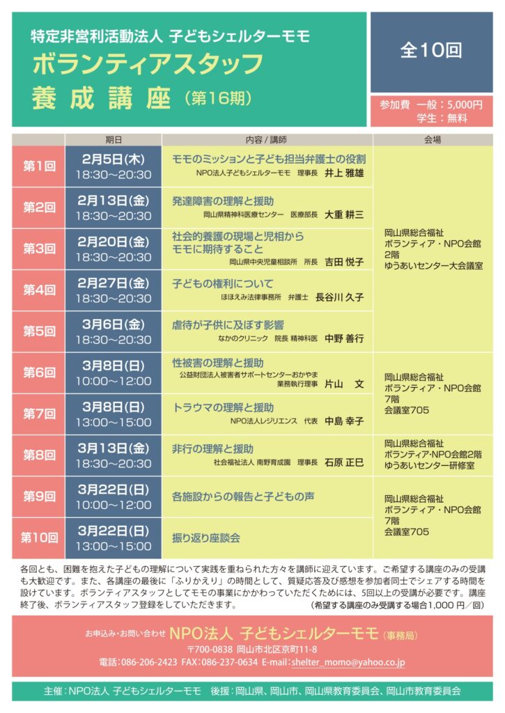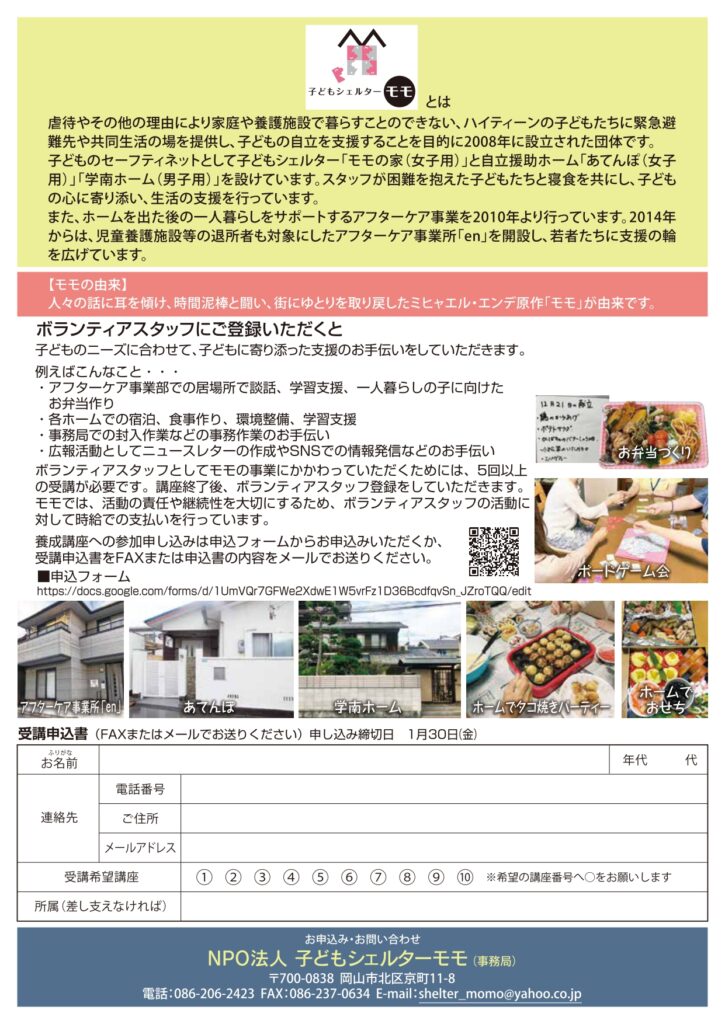 ※ボランティアスタッフとしてモモの事業にかかわっていただくためには、5回以上の受講が必要です。講座終了後、ボランティアスタッフ登録をしていただきます。