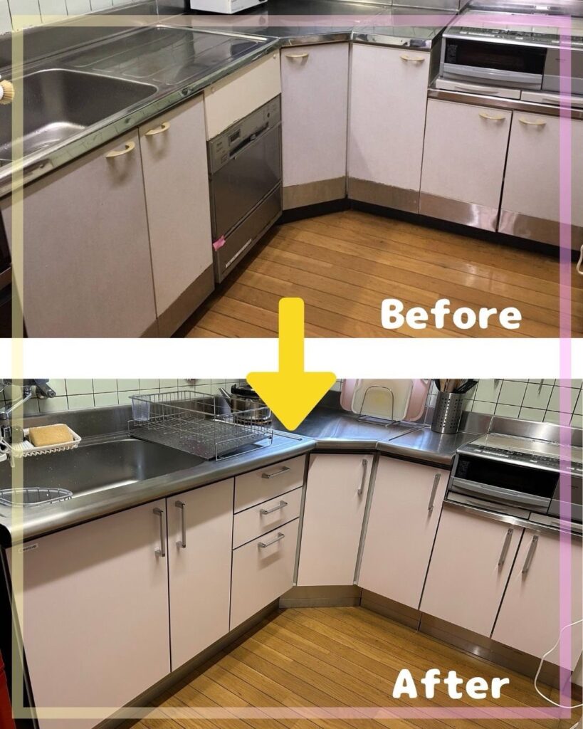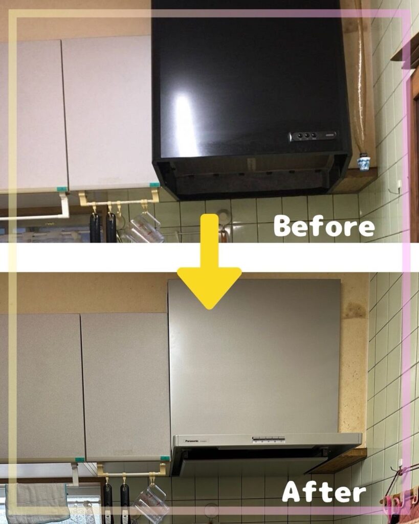 あてんぽからは、「古い換気扇が音がうるさかったりあまり吸わなくなっていたのが、新しくなって音も静かで、吸引力もあるので安全です。キッチンの下の棚は破損が多く怪我をしやすい状態だったのと、壊れた埋め込み式食洗機が無駄なスペースになっていましたが、新しくなり収納が増えて子どもも大人も使いやすくなりました。流しも広くなり洗い物がしやすいのが嬉しいです。」